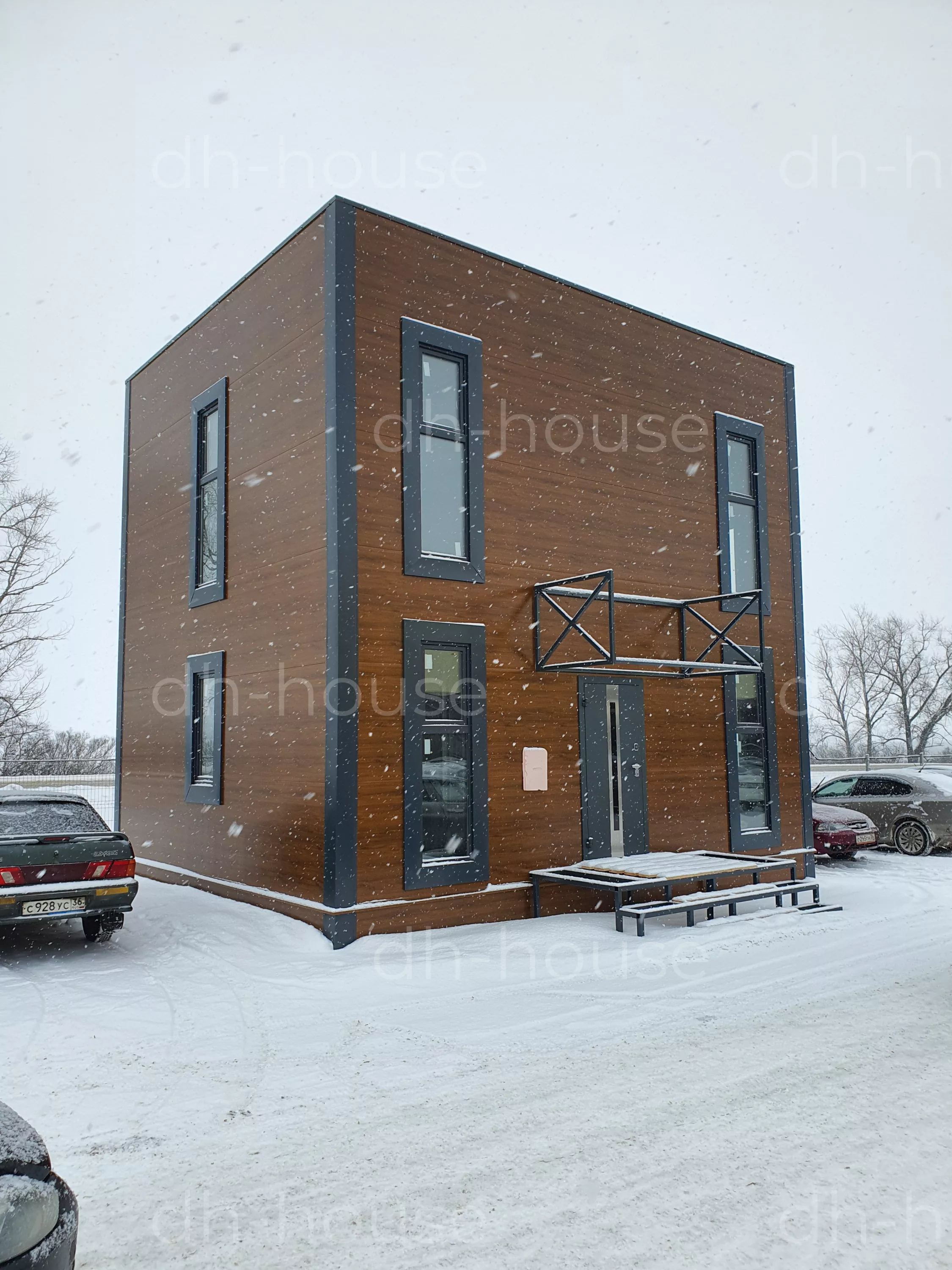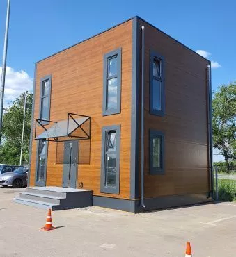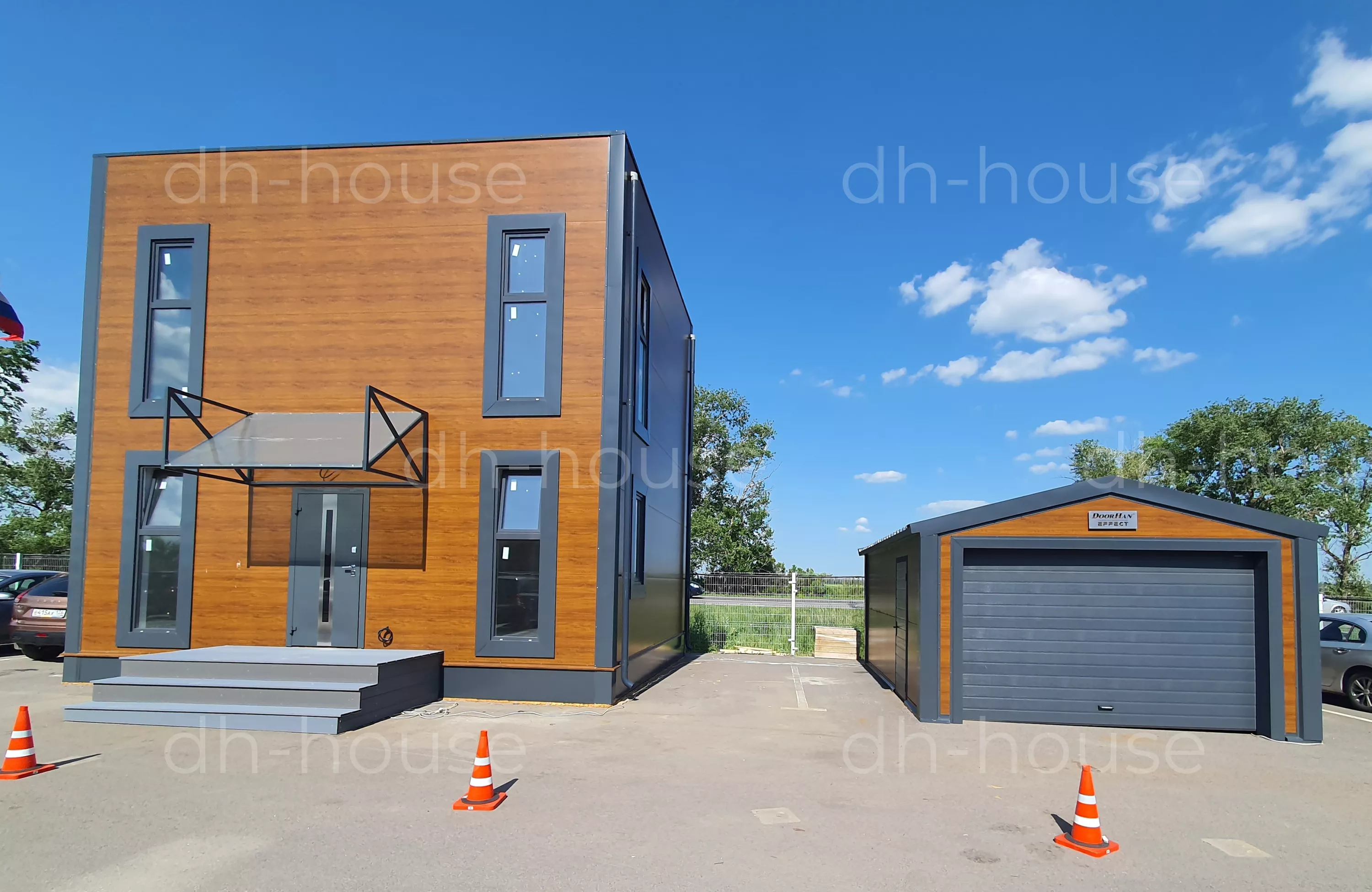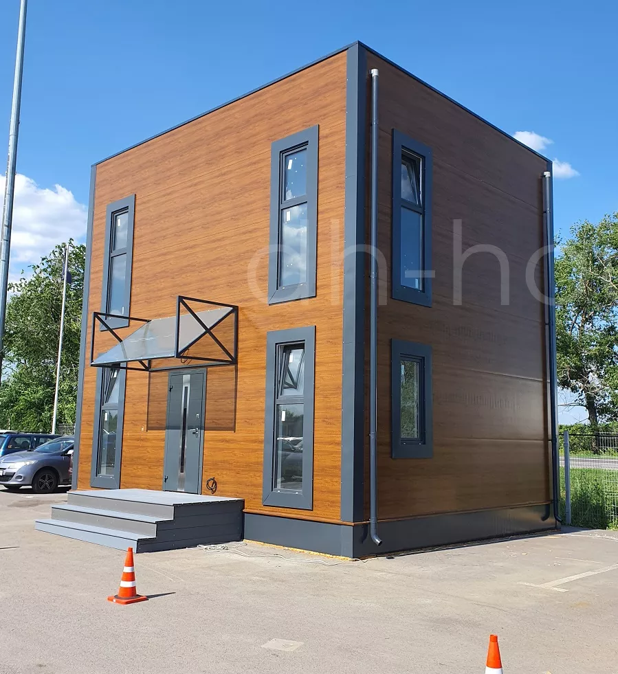Быстровозводимый модульный дом серии DoorHan Лайт 89 — современный проект, построенный из металлоконструкций и качественных материалов. Это обеспечивает высокую пожаробезопасность строения, комфортное пребывания внутри помещений в любое время года. Стильный экстерьер готового модульного дома выразительно подчеркивают высокие окна в пол. Они обеспечивают панорамный обзор и достаточное количество света, поступающего в помещение. Каркасный дом не требует дополнительной внешней или внутренней отделки. Над крыльцом размещен большой навес, защищающий ступени от снега и дождя.
